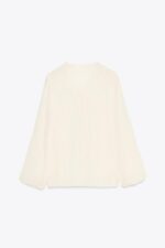 بلوز نیمه شفاف با یقه V و بند دار. آستین های بلند با سرآستین های کش دار. دارای جلوه چروک شده
