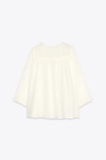 بلوز یقه گرد با یقه V و آستین های گشاد تا زیر آرنج. جزئیات تریم گلدوزی شده. بستن دکمه در جلو.