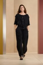 .یقه گرد و آستین کوتاه با زبانه روی شانه. جیب های جلو و جانبی در درز پنهان شده اند.