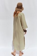 لباس تونیک کتان. دارای یقه برگردان با یقه V و آستین هایی که زیر آرنج با زبانه و دکمه تکمیل می شود.