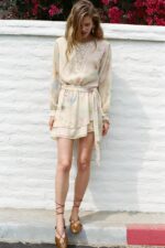 لباس یقه گرد کوتاه با آستین های بلند. دارای جزئیات قلاب بافی متضاد در قسمت جلو، کمربند کراواتی در قسمت کمر، سجاف و آستری ژولیده است.
