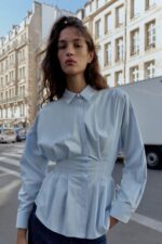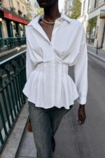 ظاهری شیک و کلاسیک دارد. یقهی کالر ساده، آستینهای بلند و طراحی دقیق چروکدار در ناحیه کمر، به محصول ساختار و زیبایی میبخشد. دکمهها در قسمت جلو مخفی شدهاند و با یک پلاتک پوشیده شدهاند، که جلوهای تمیز و مینیمال ایجاد میکند.