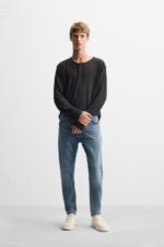 شلوار جین اسکینی زارا با پنج جیب و پارچه سنگشور شده.
